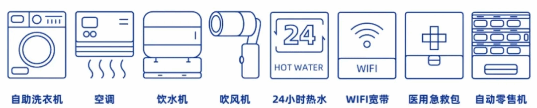 A:学校商业街位于公寓楼下,超市、饭店、便利店、水果店、理发店等商业配置齐全,瑞幸、幸运咖、蜜雪冰城、益禾堂、塔斯汀等多家知名连锁品牌进驻校园,足不出校,尽可享受城市商圈繁华。