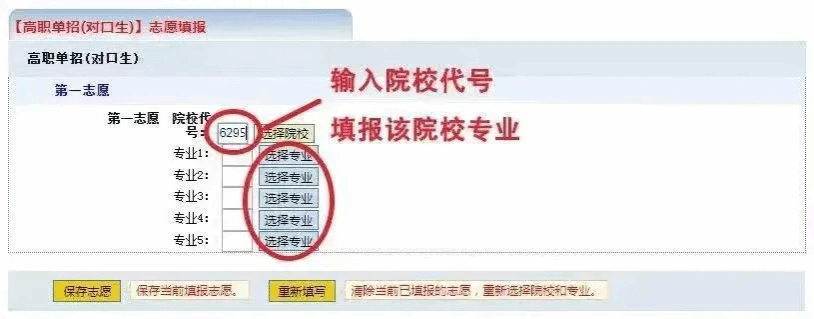在院校、专业选择页面,考生点击所选志愿,系统会自动进行填写。(输入学校代码6295,自动显示“郑州城市职业学院”,输入郑州城市职业学院的专业代号,系统自动会显示专业名称)。