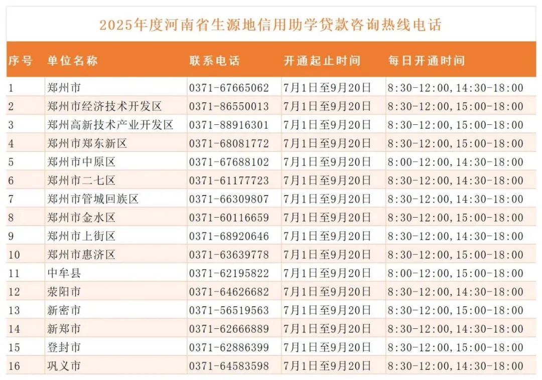 为帮助广大学生和家长及时准确了解生源地信用助学贷款政策,河南省各市、县(区)已开通生源地信用助学贷款热线电话,学生与家长如遇生源地信用助学贷款方面的问题,可通过以下联系方式进行咨询。