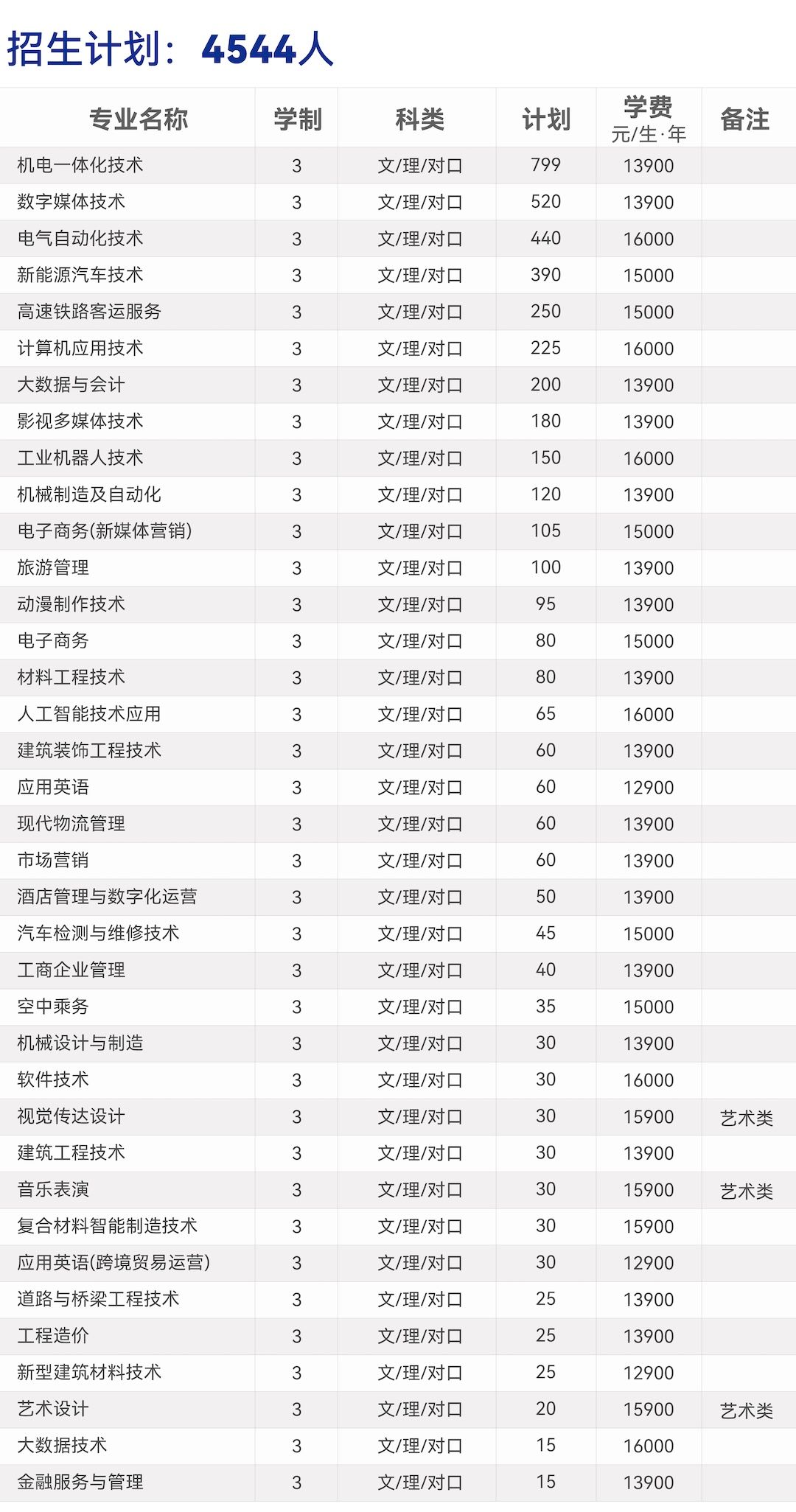郑州城市职业学院2026年单招面向37个专业招生,招生计划4544人(分专业计划数与收费标准等情况详见下表),学校可根据报考情况,调整各专业招生计划。